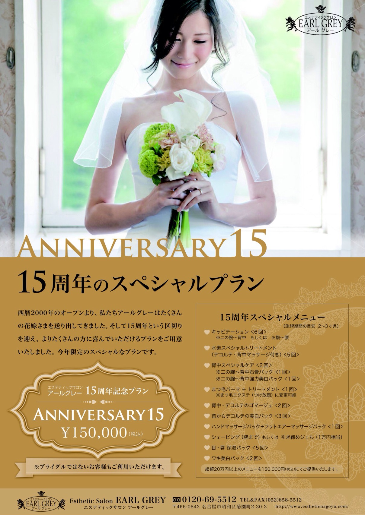 感謝の気持ちを込めた、15周年記念特別プランとして、20万円以上のケアの入ったプランを15万円でご用意しております。 ブライダルの方はもちろん、一般の方の夏のケアにもおすすめできるかなりお得な内容です。キャビテーションも、フェイシャルも、背中も、デコルテも、まつ毛も♡たっぷり使えて、期限なしです。
